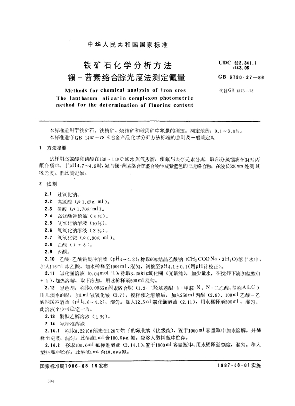 GB 6730.27-1986 铁矿石化学分析方法 镧-茜素络合腙光度法测定氟量