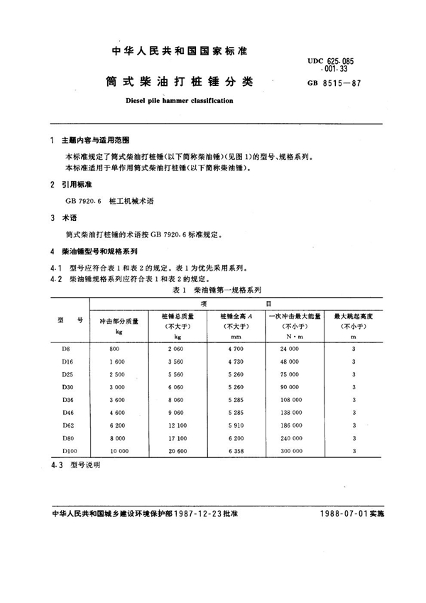 GB 8515-1987 筒式柴油打桩锤分类