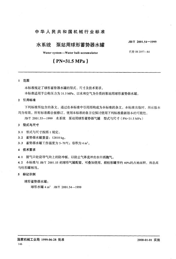 标准名称:水系统 泵站用球形蓄势器水罐 型式与尺寸(PN=31.5MPa)