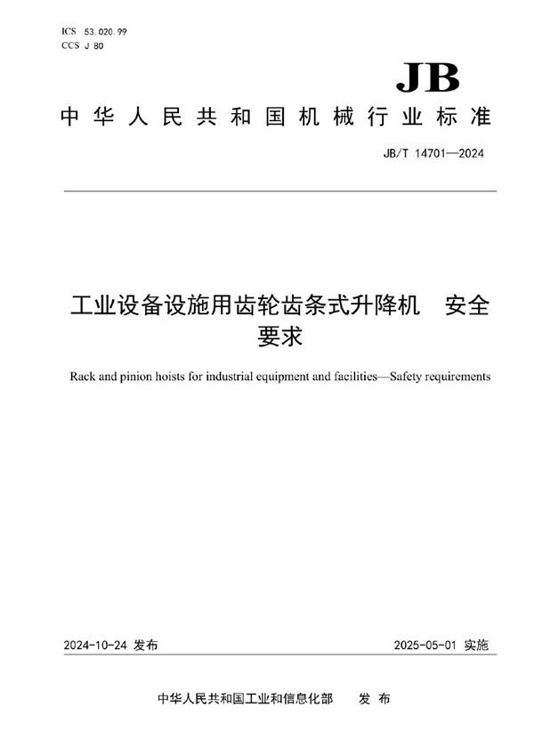 标准名称:工业设备设施用齿轮齿条式升降机 安全要求