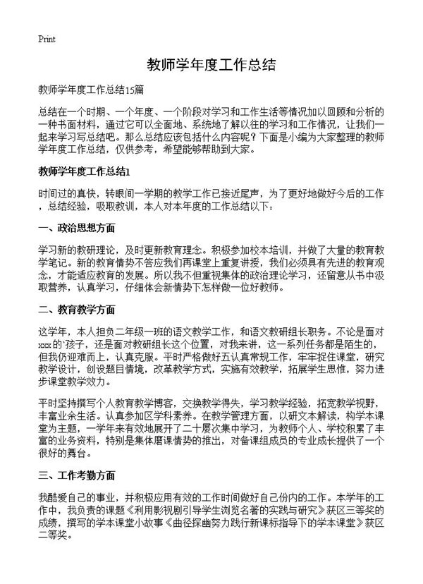 教师学年度工作总结是对过去一学年教育教学工作的全面回顾和反思,主要涵盖教学实践、学生管理、专业发展、科研成果以及个人成长等方面。通过总结,教师可以梳理工作成效,分析存在的问题,提炼经验教训,并为下一学年的工作制定改进方向和目标。这份总结不仅是个人职业发展的记录,也是学校评估教师工作的重要依据,有助于提升教育教学质量,促进教师专业素养的持续提高。