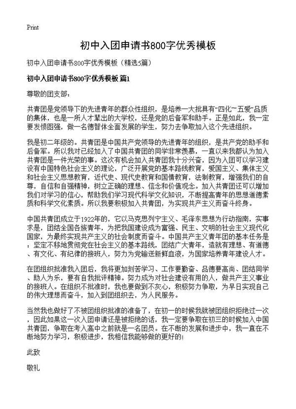 初中入团申请书800字优秀模板 (共4页) 【免费下载】