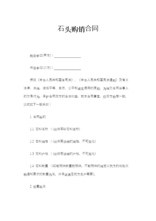 石头购销合同模板是买卖双方在进行石材交易时签署的法律文件,用于明确双方的权利和义务。该模板通常包含产品描述、规格、数量、价格、交货方式、付款条件、验收标准、违约责任等关键条款,确保交易过程规范透明,减少纠纷风险。适用于各类石材(如大理石、花岗岩、人造石等)的采购与销售场景,可根据实际需求调整具体内容。建议在使用前咨询法律专业人士以确保合规性。