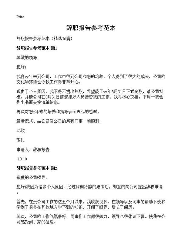 辞职报告参考范本是一份实用的文档模板,旨在帮助员工规范撰写辞职报告。它通常包含辞职原因、离职日期、感谢语等基本要素,确保内容简洁得体,避免不必要的误会。使用范本可以节省时间,同时保持专业性和礼貌性,为离职过程提供清晰的书面依据。无论是个人原因还是职业发展需求,参考范本都能帮助员工顺利完成辞职流程。