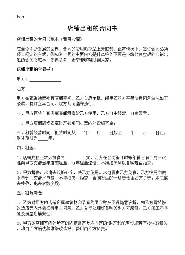 店铺出租合同书是出租方与承租方就商铺租赁事宜达成的书面协议,明确双方的权利和义务。合同内容通常包括租赁期限、租金金额及支付方式、商铺用途、装修规定、维修责任、违约责任等条款,确保租赁过程合法合规,保障双方利益。签订前应仔细阅读条款,必要时咨询法律专业人士,避免纠纷。