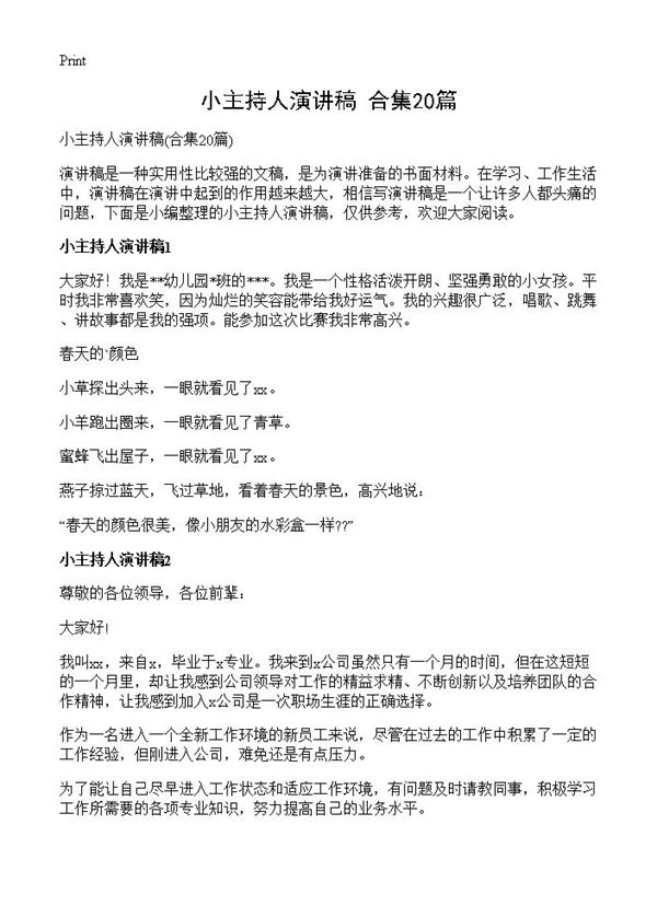 小主持人演讲稿是专门为少儿主持活动准备的讲话文稿,通常用于校园活动、文艺演出、比赛主持等场合。这类演讲稿需要语言简洁生动、内容积极向上,符合儿童的语言特点和认知水平。它一般包括开场白、节目串词、互动环节和结束语等部分,既要保持正式活动的仪式感,又要体现少儿主持的活泼特色。好的小主持人演讲稿能帮助小主持人增强自信、流畅表达,同时活跃现场气氛,引导活动顺利进行。
