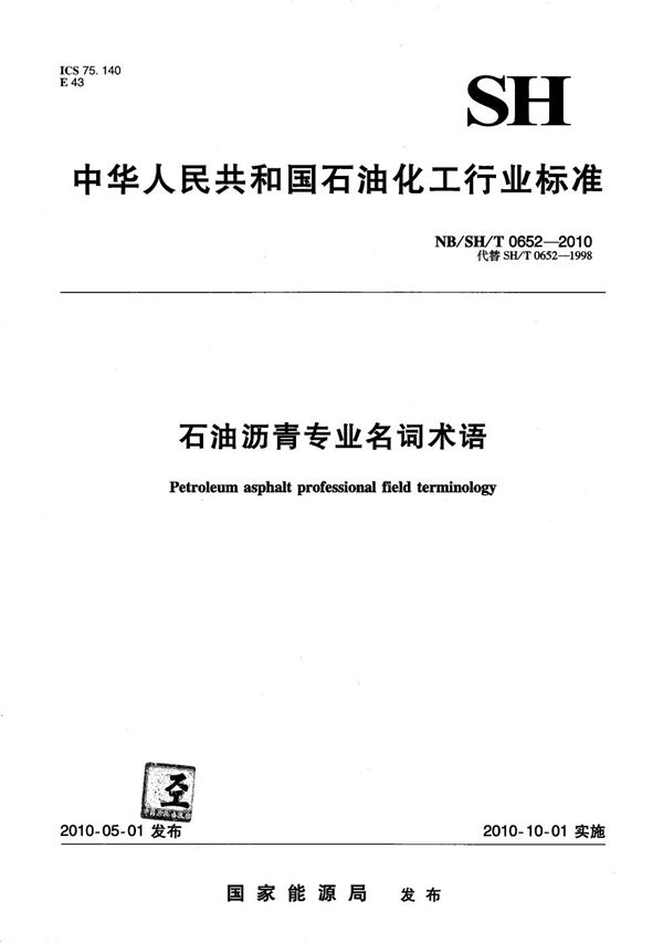 NB/SH/T0652-2010《石油沥青专业名词术语》是由中国石油化工行业发布的一项行业标准。该标准主要规定了石油沥青领域的专业名词术语及其定义,适用于石油沥青的生产、科研、教学、贸易及相关技术交流等领域。标准旨在统一石油沥青专业术语的使用,避免因术语不统一而造成的误解和混淆,促进行业内的规范化和标准化。该标准由中国石油化工集团公司提出,全国石油产品和润滑剂标准化技术委员会归口,是石油沥青行业重要的基础性标准之一。