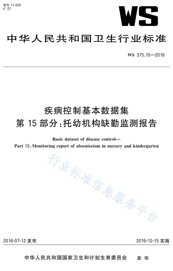 WS375.15-2016《疾病控制基本数据集第15部分托幼机构缺勤监测报告》是由中国国家卫生和计划生育委员会发布的卫生行业标准。该标准规定了托幼机构缺勤监测报告的基本数据集内容,包括数据元名称、定义、数据类型、格式和值域等要求,旨在规范托幼机构缺勤监测信息的采集、存储和交换,为疾病预防控制提供数据支持。该标准适用于各级疾病预防控制机构、托幼机构及相关信息系统建设,有助于提高托幼机构传染病监测和防控能力,保障儿童健康。