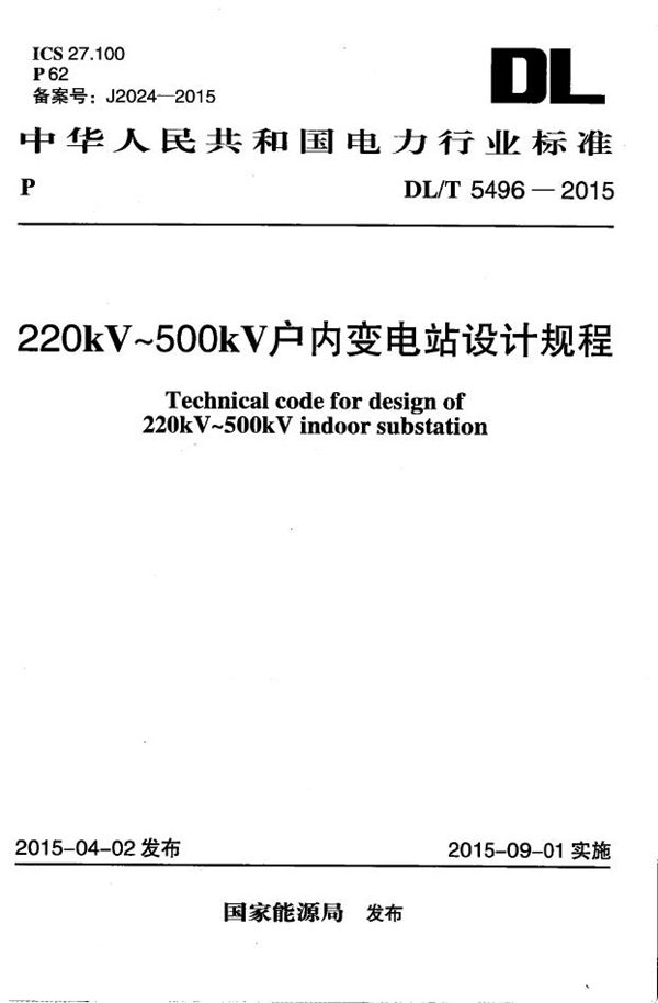 DL/T5496-2015《220kV-500kV户内变电站设计规程》是由中国电力企业联合会发布的一项电力行业标准。该规程主要针对220kV至500kV电压等级的户内变电站设计,规定了其设计原则、技术要求、设备选型、布置方式、安全防护等方面的内容。该标准适用于新建、扩建和改建的220kV-500kV户内变电站工程,旨在确保变电站设计的安全性、可靠性、经济性和环保性,同时满足电力系统运行和维护的要求。该规程的发布为户内变电站的设计提供了统一的技术依据,有助于提高变电站的建设质量和运行效率。
