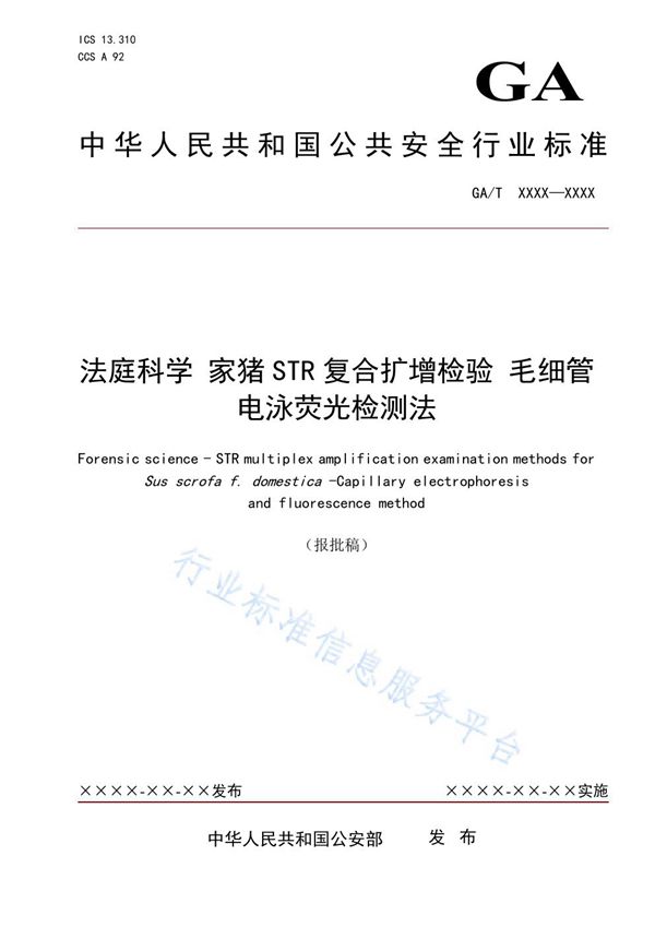 GA/T1964-2021《法庭科学家猪STR复合扩增检验毛细管电泳荧光检测法》是由中华人民共和国公安部发布的行业标准,主要应用于法庭科学领域。该标准规定了家猪STR(短串联重复序列)复合扩增检验的毛细管电泳荧光检测方法,适用于家猪个体识别、亲缘关系鉴定以及相关法医物证检验。该标准详细描述了实验原理、试剂与材料、仪器设备、检验步骤、数据分析及结果判定等内容,为家猪STR检测提供了规范化的技术流程,确保检验结果的准确性和可靠性。该标准的实施有助于提升法庭科学中家猪DNA检验的标准化水平,为案件侦办和司法鉴定提供科学依据。