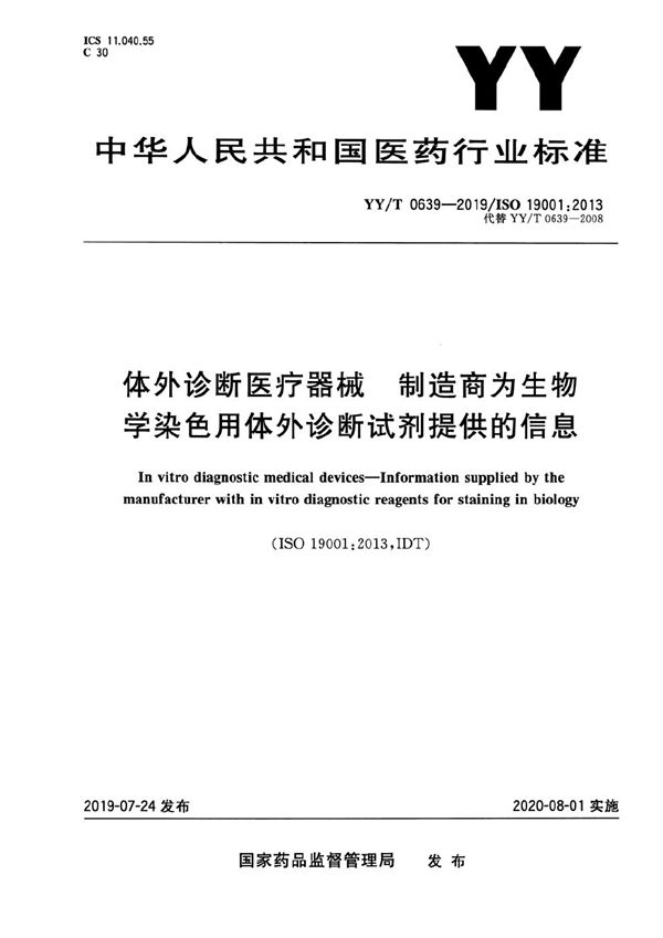 YY/T0639-2019《体外诊断医疗器械制造商为生物学染色用体外诊断试剂提供的信息》是中国医药行业标准,主要规定了制造商为生物学染色用体外诊断试剂(IVD)提供信息的要求。该标准适用于体外诊断试剂的制造商,旨在确保试剂的安全性和有效性,同时为用户提供清晰、准确的使用说明和技术信息。标准内容包括试剂的预期用途、性能特性、储存条件、有效期、使用方法和注意事项等,帮助用户正确操作并降低潜在风险。该标准的实施有助于规范体外诊断试剂市场,提升产品质量,保障医疗检测的准确性和可靠性。
