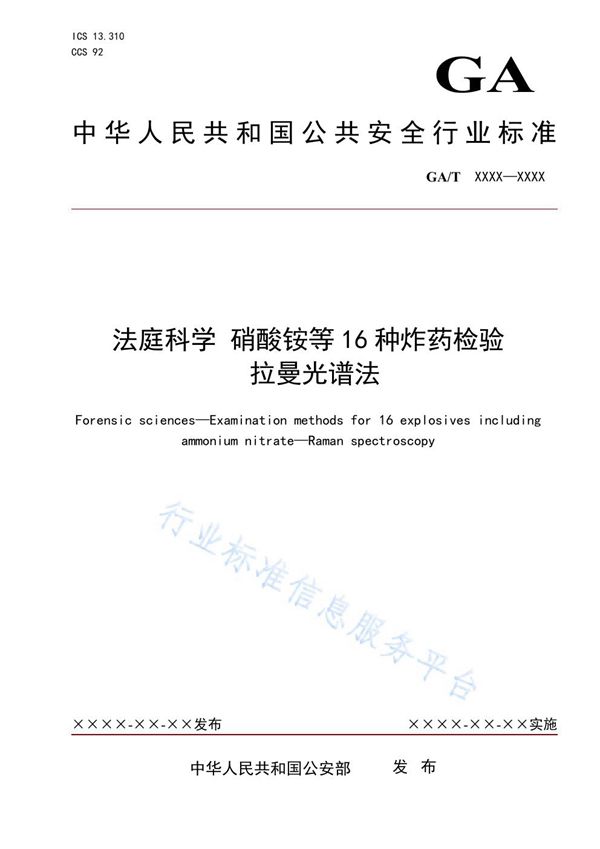 GA/T1943-2021《法庭科学硝酸铵等16种炸药检验拉曼光谱法》是由中华人民共和国公安部发布的一项行业标准,主要应用于法庭科学领域中对爆炸物成分的快速、无损检测。该标准规定了使用拉曼光谱技术对硝酸铵等16种常见炸药进行定性检验的方法,包括样品制备、仪器操作、谱图分析和结果判定等技术要求。拉曼光谱法因其快速、非破坏性、高特异性等优势,成为爆炸物现场检测和实验室分析的重要技术手段。该标准的实施为公安机关和司法鉴定机构提供了统一的技术规范,有助于提高爆炸案件物证检验的科学性和准确性,为案件侦破和司法审判提供可靠的技术支持。