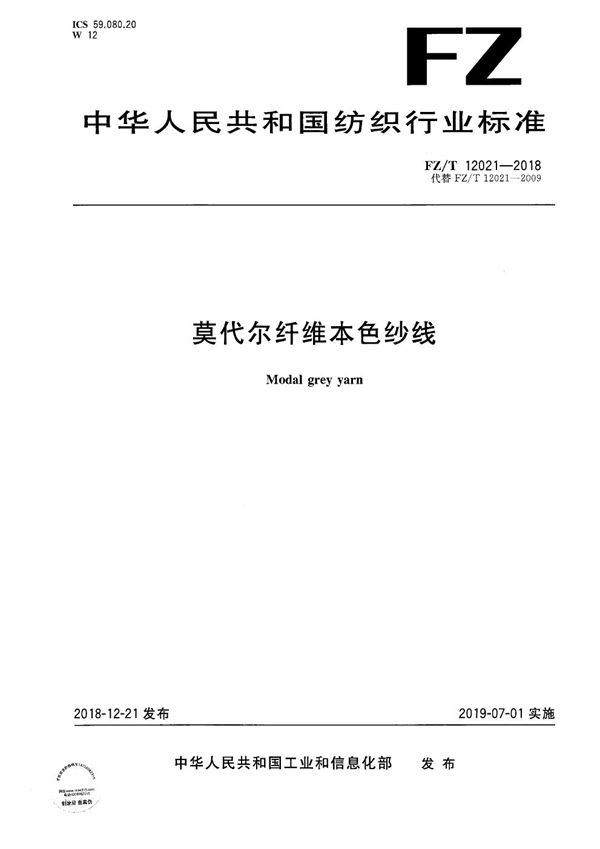 FZ/T12021-2018《莫代尔纤维本色纱线》是由中华人民共和国工业和信息化部发布的纺织行业标准。该标准规定了莫代尔纤维本色纱线的产品分类、技术要求、试验方法、检验规则以及标志、包装、运输和贮存的要求。适用于以莫代尔纤维为原料生产的本色纱线,包括纯纺和混纺产品。标准旨在规范莫代尔纤维本色纱线的生产与质量控制,确保产品性能符合行业要求,为生产企业和检测机构提供统一的技术依据,促进产品质量提升和市场规范化发展。