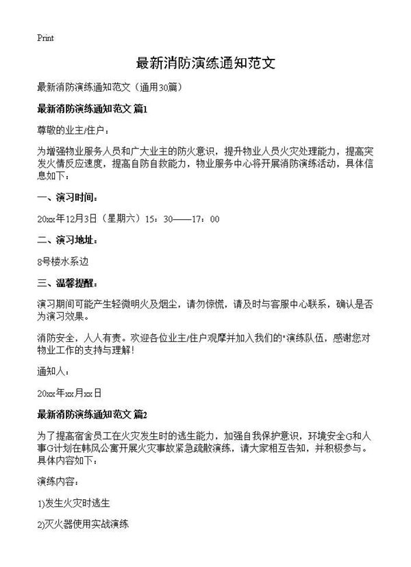 最新消防演练通知范文是单位或社区组织消防演练时使用的正式文书,主要用于告知相关人员演练的时间、地点、内容及注意事项。该范文通常包含演练目的、参与对象、具体安排、安全要求等关键信息,确保演练有序进行并提升参与者的消防安全意识和应急能力。通知语言需简洁明确,格式规范,以便于快速传达和落实。各单位可根据实际情况调整内容,确保演练的针对性和实效性。