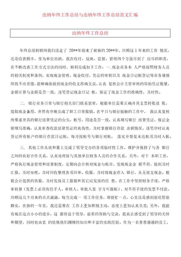 出纳年终总结范文是财务人员在年度结束时对一年工作进行回顾与分析的书面材料。它通常包括现金收支管理、银行对账、票据处理等日常工作的完成情况,以及工作中遇到的问题和改进措施。总结中还会涉及个人能力提升、团队协作等方面的内容,并对下一年度的工作提出计划和目标。这类范文为出纳人员撰写自己的年终总结提供了参考框架和思路,帮助其系统梳理工作成果,展示专业能力,同时为未来的工作改进指明方向。
