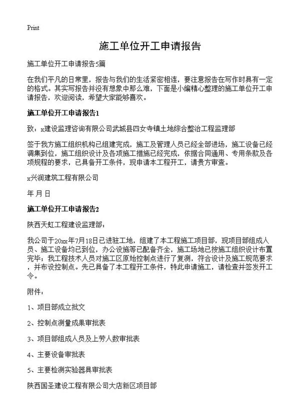 施工单位开工申请报告是施工单位在正式开展工程施工前,向建设单位或监理单位提交的重要文件。该报告主要用于说明施工前的各项准备工作已完成,具备开工条件,并申请批准正式开工。报告内容通常包括工程概况、施工组织设计、人员设备配置、材料准备、安全措施、质量保障体系等。提交开工申请报告是工程建设程序中的重要环节,也是施工单位履行合同义务、确保工程顺利实施的关键步骤。建设单位或监理单位在收到报告后,将审核各项准备工作是否符合要求,并作出是否同意开工的批复。