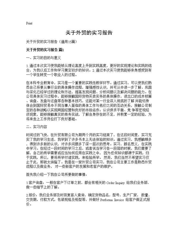 本次实习报告主要围绕本人在某外贸公司的实习经历展开,详细记录了实习期间的工作内容、学习收获以及对外贸行业的深入理解。报告首先介绍了公司的基本情况和主要业务范围,随后重点描述了本人参与的客户开发、订单跟进、单证处理等具体工作内容。通过实习,我不仅掌握了外贸业务流程和操作规范,还提升了跨文化沟通能力和商务英语水平。报告最后总结了实习心得,分析了外贸行业的发展趋势,并对未来职业规划提出了思考。本次实习让我将理论知识与实践相结合,为今后从事外贸工作奠定了坚实基础。
