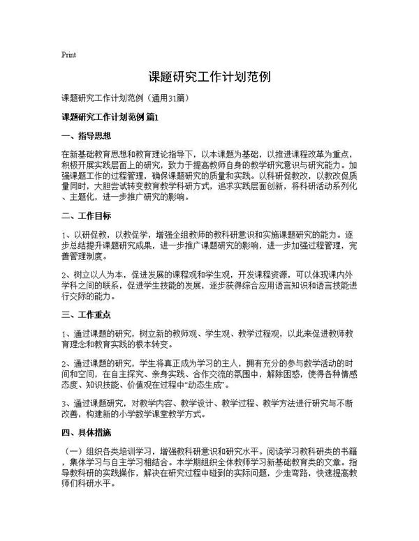 课题研究工作计划范例是一份详细规划研究过程的指导性文件,旨在为研究者提供清晰的工作框架和时间安排。它通常包括研究背景、目标、内容、方法、进度安排、预期成果及资源需求等核心要素。通过制定科学合理的工作计划,研究者可以明确研究方向,合理分配时间和资源,确保课题有序推进并取得预期成果。范例的制定应结合具体课题特点,注重可操作性和实效性,同时保持一定的灵活性以应对研究过程中可能出现的变化。