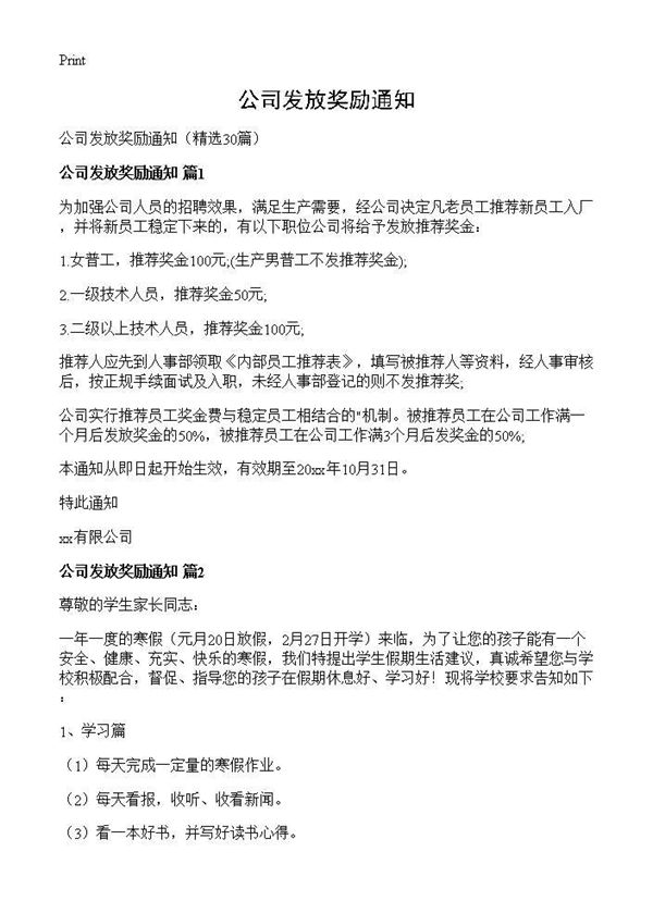 公司发放奖励通知是为了表彰和激励员工在工作中表现突出、贡献显著的优秀个人或团队。通过发放奖励,公司旨在肯定员工的努力和成绩,进一步激发工作热情,增强团队凝聚力,营造积极向上的企业文化氛围。奖励形式多样,包括但不限于奖金、奖品、荣誉证书、晋升机会等。公司将根据员工的实际表现和贡献程度,公平、公正、公开地进行评选和发放。希望全体员工以此为榜样,再接再厉,共同推动公司持续健康发展。