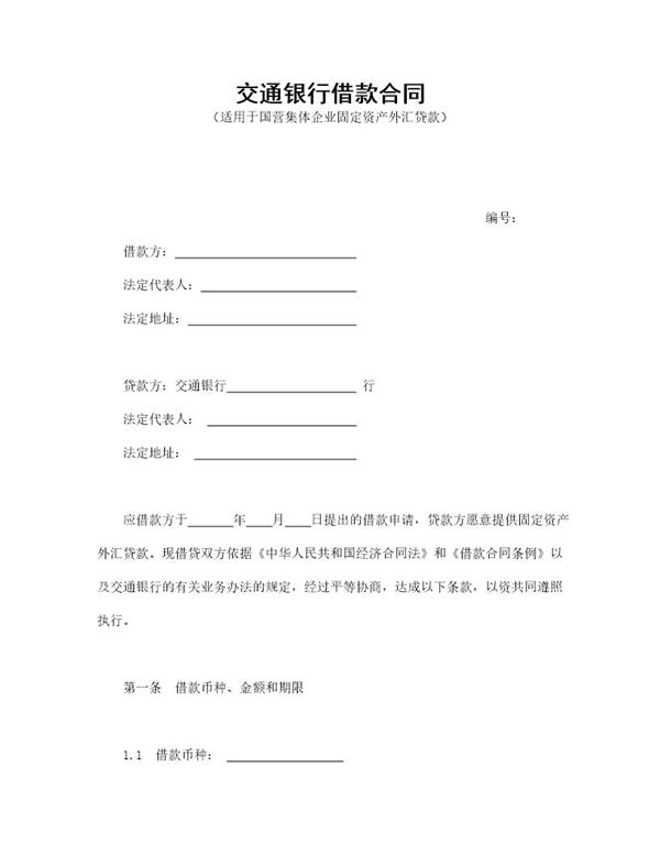 交通银行借款合同(适用于国营集体企业固定资产外汇贷款) (共6页) 【免费下载】