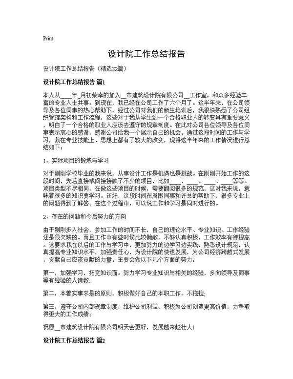 设计院工作总结报告是对过去一段时间内设计院各项工作的全面回顾与系统梳理。报告主要涵盖项目完成情况、技术创新成果、团队协作表现、质量管理成效以及成本控制等方面内容。通过总结成绩与不足,分析行业趋势与市场变化,为下一阶段工作提供改进方向和决策依据。报告旨在客观反映设计院整体运营状况,展示专业实力与服务水准,同时促进内部经验交流与管理优化,推动设计院持续健康发展。