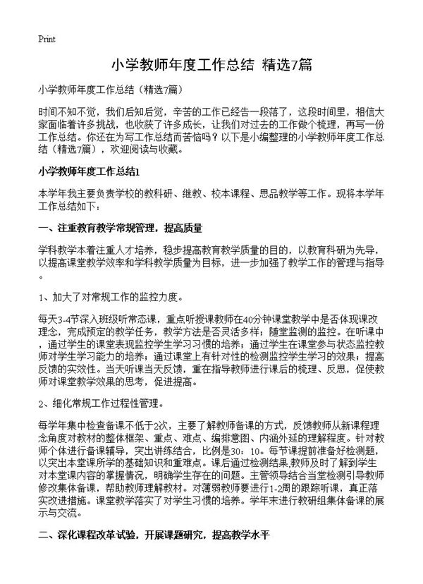 本年度工作总结旨在回顾和反思过去一年小学教师在教学、班级管理、学生发展以及个人专业成长等方面的工作成果与经验。通过梳理教学实践中的亮点与不足,总结有效的教育方法和策略,同时分析面临的挑战及改进方向。这份总结不仅是对个人工作的系统回顾,也为下一年的教育教学工作提供参考和规划依据,力求在提升教学质量、促进学生全面发展方面取得更大进步。