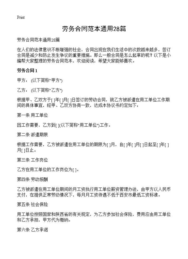 劳务合同范本通用是指适用于各类劳务合作场景的标准合同模板,其核心作用是明确雇主与劳务提供方之间的权利义务关系,保障双方合法权益。这类范本通常包含以下关键条款:合同主体信息、工作内容与要求、服务期限、劳务报酬标准及支付方式、双方权利义务、保密条款、合同解除条件、违约责任以及争议解决机制等。通用范本具有规范性、公平性和适应性强的特点,既符合《民法典》《劳动合同法》等法律法规要求,又能根据具体劳务类型(如临时用工、项目外包、专业技术服务等)进行条款调整。使用时应特别注意:根据实际用工性质区分劳务关系与劳动关系,避免条款混用;对特殊行业要求(如资质许可、安全规范)需作专项约定;建议由专业法律人士审核,确保条款合法有效。