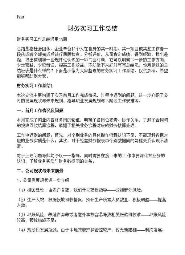 在财务实习期间,我主要负责协助处理日常账务、凭证录入、报表编制以及税务申报等工作。通过实践,我深入了解了财务流程,提升了Excel和财务软件的操作能力,同时培养了严谨细致的工作态度。这段实习经历让我将理论知识与实际工作相结合,为未来的职业发展打下了坚实基础。