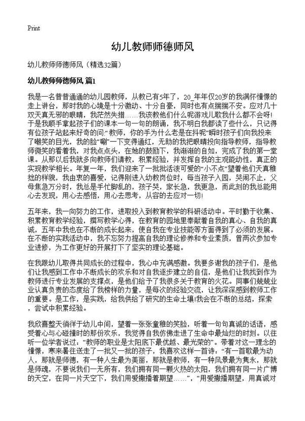 幼儿教师师德师风是教师职业素养的核心体现,它涵盖了教师的道德品质、职业操守和教育行为。作为幼儿成长的启蒙者和引路人,幼儿教师不仅需要具备专业的教育技能,更要以高尚的师德和良好的师风为准则。师德要求教师关爱每一个幼儿,尊重他们的个性发展,做到公平公正、耐心细致;师风则体现在教师的言行举止、仪表风范和教育态度上,要以身作则,成为幼儿学习的榜样。良好的师德师风能够营造和谐的师生关系,促进幼儿身心健康发展,为他们的未来奠定坚实基础。幼儿教师应时刻牢记自己的责任与使命,以爱心、责任心和奉献精神投身于教育事业,为培养祖国的下一代贡献力量。