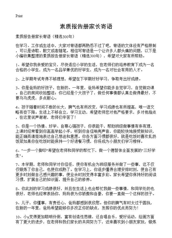 素质报告册家长寄语是家长对孩子在校表现的综合评价和期望表达。它通常包含对孩子学习态度、品德发展、行为习惯等方面的观察与建议,同时也传递家长对孩子的鼓励与关爱。家长可以通过寄语与学校沟通,共同关注孩子的成长,帮助孩子树立信心、明确目标,促进全面发展。寄语内容应真诚、具体,既肯定优点,也提出改进方向,体现家校共育的理念。