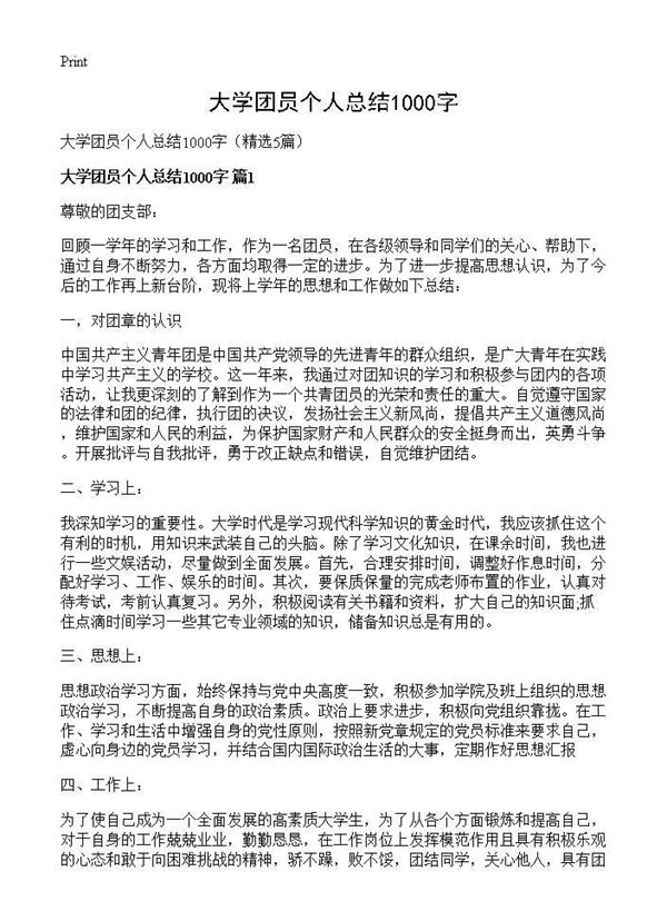 大学团员个人总结1000字 (共5页) 【免费下载】