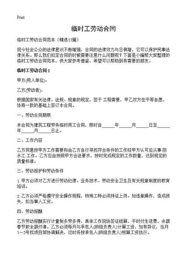 临时工劳动合同是指用人单位与临时工之间签订的明确双方权利和义务的协议。该合同通常适用于短期、季节性、项目制或临时性工作岗位,合同期限相对较短,工作内容灵活。合同中需明确工作内容、工作时间、薪酬标准、保险福利、合同期限及终止条件等条款。临时工劳动合同既保障了用人单位的用工需求,也维护了临时工的合法权益,确保双方在合法合规的前提下建立劳动关系。