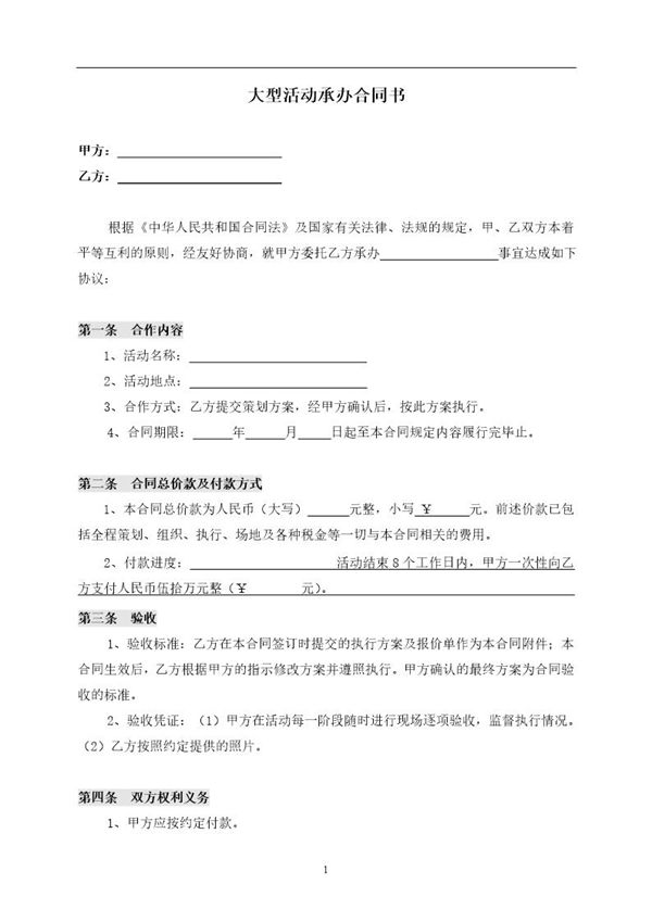 大型活动承办合同是指活动主办方与承办方之间签订的具有法律效力的协议文件,用于明确双方在大型活动(如会议、展览、演出、体育赛事等)筹备与执行过程中的权利、义务和责任。合同内容通常涵盖活动基本信息(时间、地点、规模)、服务范围(策划、场地布置、设备租赁、人员调配等)、费用支付方式、违约责任、保险条款、知识产权归属以及不可抗力处理等核心条款。该合同旨在规范双方合作流程,降低履约风险,确保活动顺利实施,并为可能出现的争议提供法律解决依据。