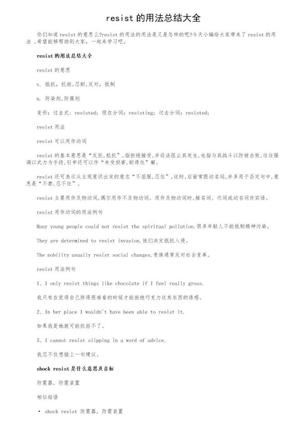 resist是一个常用的英语动词,主要表示“抵抗、反抗、抵制”的意思。它既可以指物理上的抵抗,也可以指心理上的抗拒。resist的用法比较灵活,可以接名词、动名词作宾语,也可以用于被动语态。常见的搭配有resisttemptation(抵制诱惑)、resistchange(抗拒改变)、resistarrest(拒捕)等。掌握resist的不同用法对准确表达“抵抗”这一概念非常重要。本文将全面总结resist的用法,包括基本释义、常见搭配、语法结构以及例句解析,帮助读者彻底掌握这个常用动词的用法。