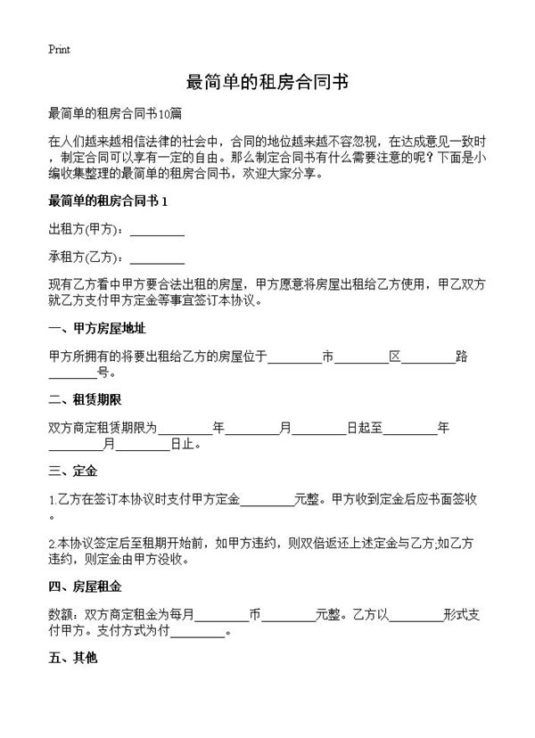 最简单的租房合同书是一份基础且实用的法律文件,用于明确房东和租客之间的权利与义务。它通常包含房屋地址、租金金额、支付方式、租期、押金条款以及双方的基本责任等关键内容。这份合同力求简洁明了,避免复杂条款,适合短期租赁或双方信任度较高的情况使用。签订前双方应仔细阅读,确保无异议,必要时可咨询法律人士,以保障自身权益。