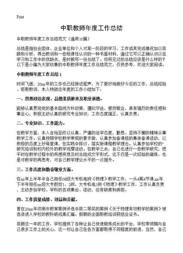 本年度工作总结主要围绕中职教师的教学工作、学生管理、专业发展等方面展开。在过去一年中,我认真履行教师职责,积极参与课堂教学改革,注重学生技能培养与职业素养提升。通过优化教学方法、加强实训指导、参与教研活动等方式,不断提升教学质量。同时,在班级管理工作中坚持德育为先,关注学生心理健康与职业规划指导。此外,我还通过参加培训、考取职业资格证书等途径促进自身专业成长。现将本年度的具体工作内容、取得的成绩以及存在的不足进行系统梳理,为今后工作改进提供参考依据。
