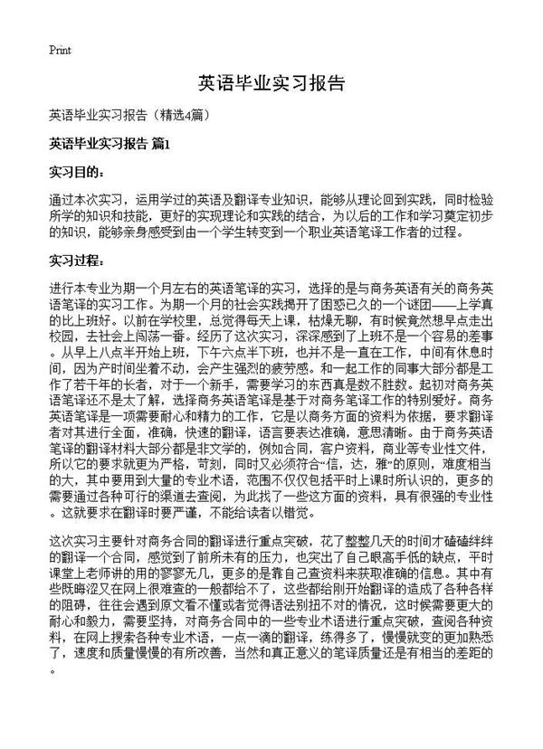 英语毕业实习报告是学生在完成英语专业学习后,对实习期间所学知识和实践经验的总结与反思。这份报告通常包括实习单位介绍、实习岗位职责、具体工作内容、遇到的挑战及解决方法、个人成长与收获等部分。通过撰写实习报告,学生能够系统梳理实习经历,将理论知识与实际应用相结合,同时展示自身的专业能力和职业素养。报告不仅是对实习成果的总结,也是对未来职业发展的重要参考。