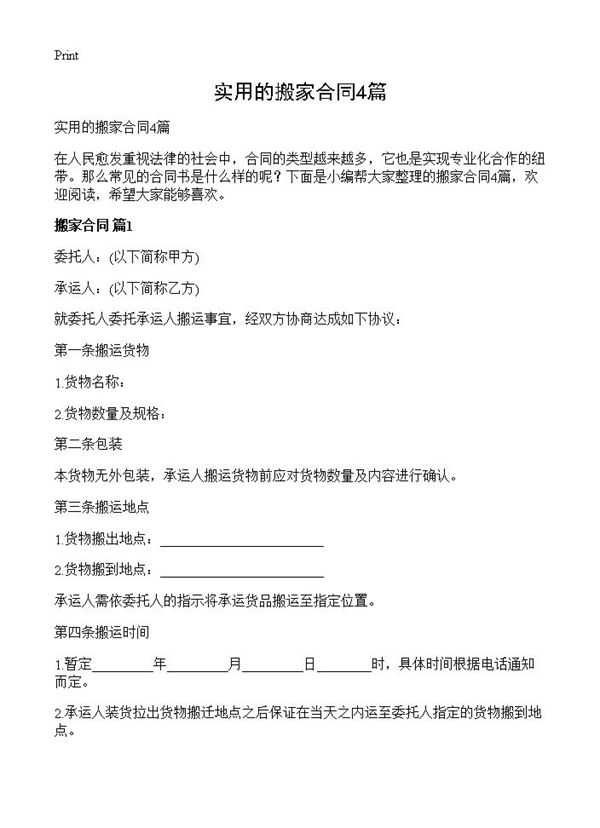 搬家合同是确保搬家过程顺利、避免纠纷的重要法律文件。一份实用的搬家合同应明确双方的权利和义务,包括服务内容、费用明细、时间安排、物品损坏赔偿等关键条款。合同还应涵盖特殊情况处理方式,如天气延误或额外服务需求。清晰的条款能保护客户和搬家公司的合法权益,减少误解风险。建议在签约前仔细阅读合同细节,必要时咨询法律专业人士,确保合同公平合理且符合当地法规要求。