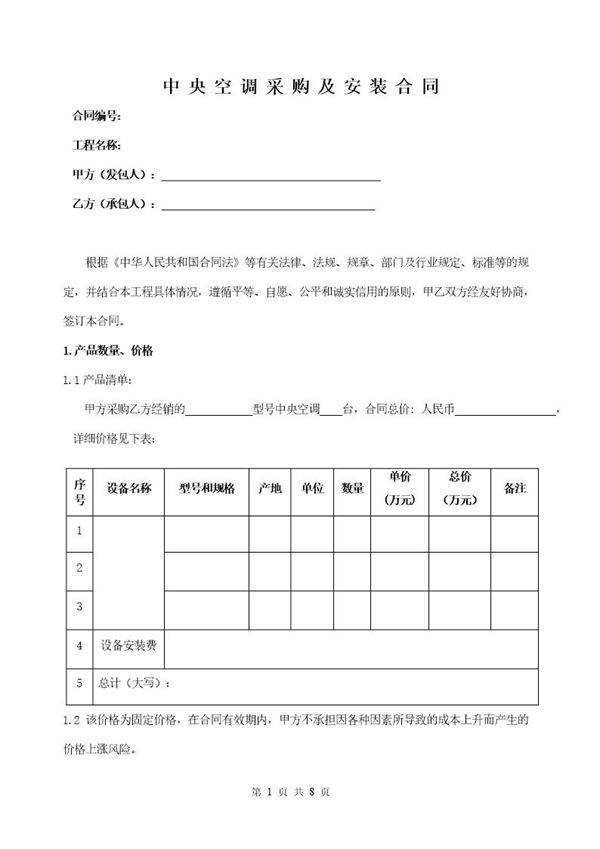 中央空调采购及安装合同范本 (共8页) 【免费下载】