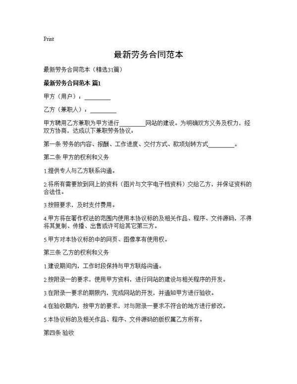 最新劳务合同范本是根据现行劳动法律法规和政策要求制定的标准化合同文本,旨在规范用人单位与劳动者之间的权利义务关系。该范本涵盖了合同期限、工作内容、工作时间、劳动报酬、社会保险、劳动保护、合同解除等核心条款,确保合同内容合法合规,同时兼顾双方权益。使用最新劳务合同范本有助于减少劳动纠纷,保障劳动关系和谐稳定,适用于各类企业及用工场景。建议用人单位根据实际情况在范本基础上进行适当调整,并确保合同签订过程符合法定程序。