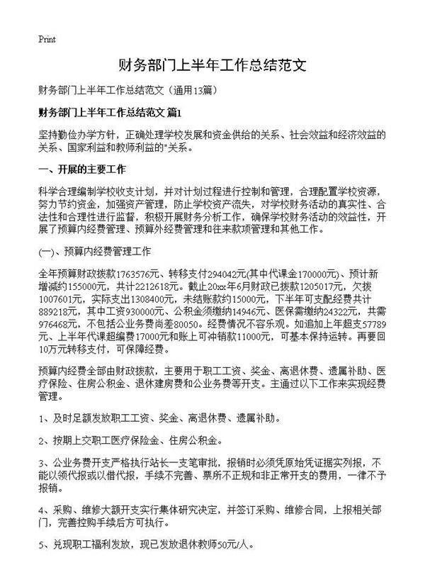 财务部门上半年工作总结范文是对财务部门在过去六个月中各项工作的全面回顾与分析。该总结通常包括收入支出情况、预算执行进度、成本控制措施、资金管理成效、税务合规情况以及团队协作与改进方向等内容。通过数据对比和实例说明,既展示工作成果,也客观反映存在的问题,并提出下半年优化建议,为后续财务决策提供依据。这类范文结构清晰,语言简练,注重用数据支撑结论,可作为财务人员撰写总结的参考模板。