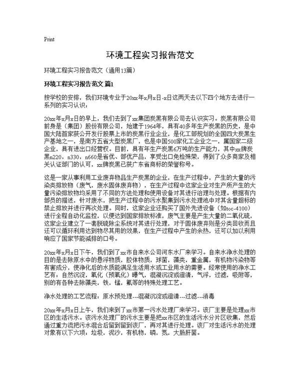 环境工程实习报告范文是环境工程专业学生在完成实习任务后撰写的重要文档,主要用于总结实习期间的学习成果和实践经验。报告通常包括实习单位介绍、实习内容与过程、专业技能应用、问题分析与解决方案、个人收获与反思等部分。通过实习报告,学生能够系统梳理实习经历,将理论知识与实际工作相结合,同时展示自身在环境监测、污染治理、工程设计等领域的实践能力。范文可为学生提供结构参考和写作思路,帮助其规范撰写实习报告,提升报告质量。