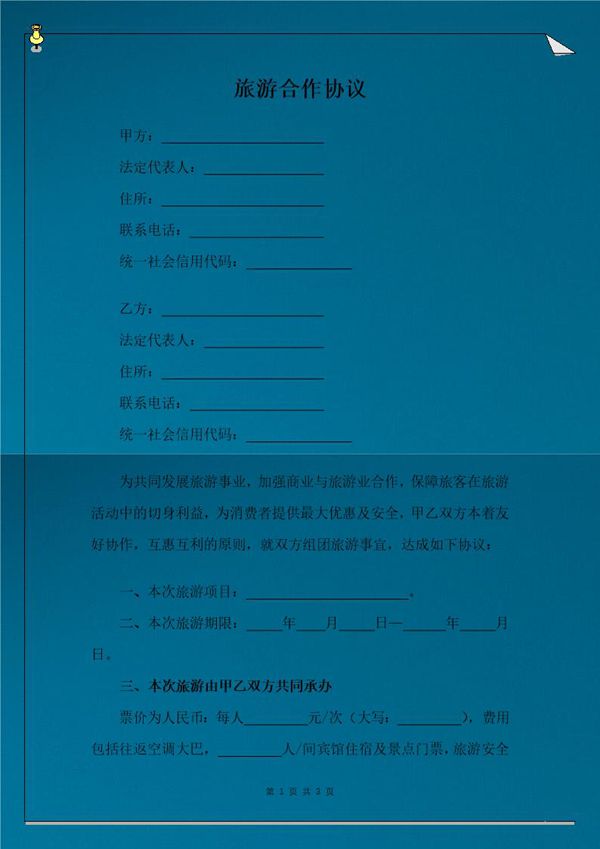 旅游合作协议模板是用于规范旅游行业合作双方权利和义务的标准文件。该模板通常包含合作范围、责任划分、费用结算、服务标准、违约责任等核心条款,适用于旅行社、景区、酒店、交通服务商等各类旅游企业之间的合作。通过签订此类协议,合作双方可以明确业务对接流程,保障服务质量,防范潜在纠纷,为旅游产品整合与市场推广提供法律依据。模板可根据具体合作模式(如地接合作、票务代理、联合营销等)进行调整,建议在使用前由专业法律人士审核。