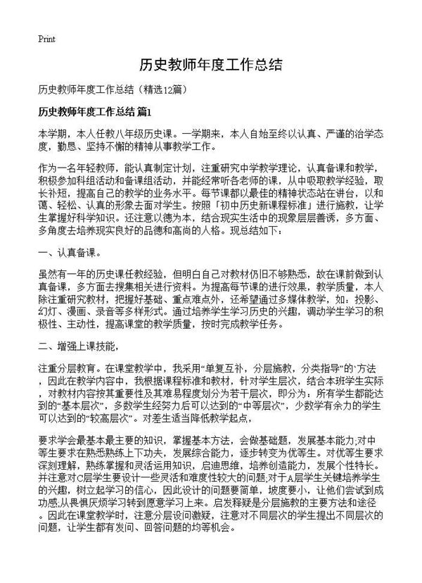 本年度,历史教师工作总结围绕教学实践、学生成长、教研成果和个人发展四个方面展开。在教学方面,通过创新教学方法和多元化评价体系,有效提升了学生的历史素养与学习兴趣;针对不同学情实施分层教学,关注学生个性化发展。教研上积极参与课题研究、公开课展示及校本课程开发,推动学科建设。同时,通过培训学习与反思改进,持续优化专业能力。总结既梳理了经验成果,也针对不足制定了改进计划,为下一年度工作明确了方向。