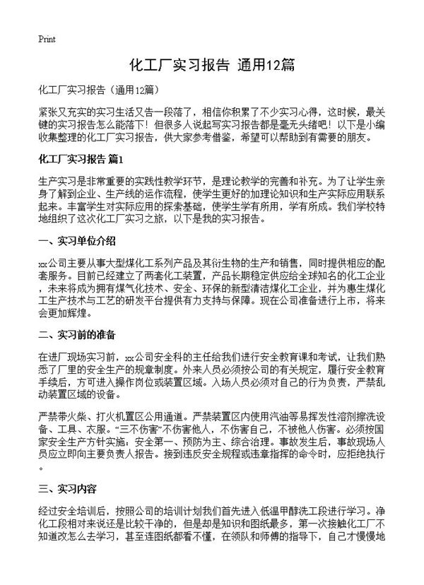 本次化工厂实习旨在通过实地学习和实践操作,深入了解化工生产流程、设备运行及安全管理等内容。在实习期间,我参与了多个生产环节的观摩与操作,熟悉了化工厂的日常运作模式,掌握了相关化工设备的基本操作技能,并对化工生产中的安全规范与环保要求有了更深刻的认识。通过本次实习,我不仅将课堂所学理论知识与实际生产相结合,还提升了自身的实践能力和职业素养,为今后从事化工行业相关工作奠定了坚实基础。