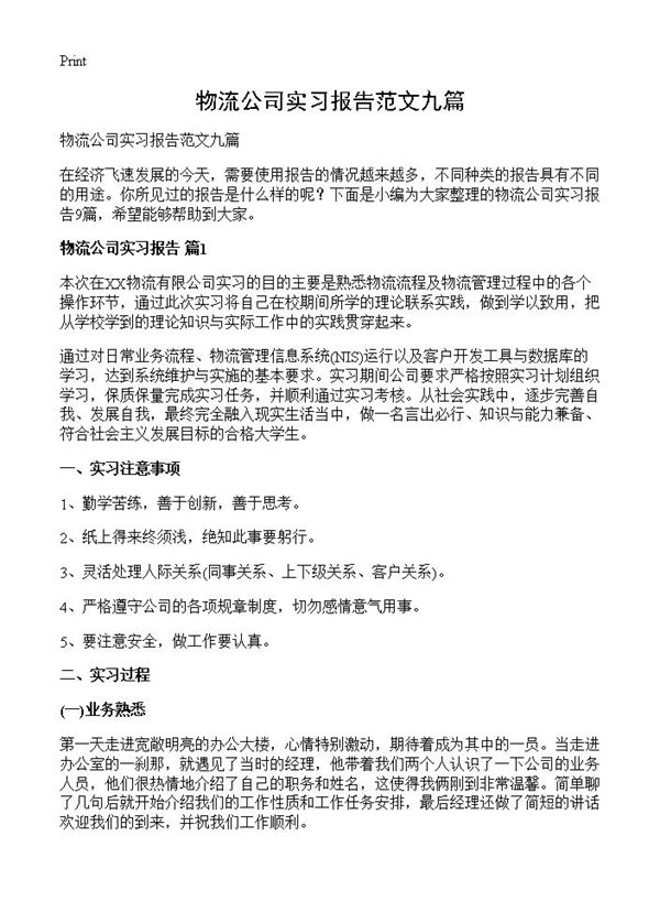 以下是一段关于"物流公司实习报告范文九篇"的简介:本合集精选了九篇物流公司实习报告范文,涵盖不同岗位和业务场景的实习经历总结。这些范文包括仓储管理、运输调度、供应链协调等典型物流岗位的实习报告,每篇均包含实习单位介绍、工作内容描述、专业知识应用、个人收获体会等标准模块。范文内容涉及传统物流企业和现代供应链企业的实习案例,既有流程性工作的详细记录,也有对行业现状的分析思考。这些实习报告可为物流管理专业学生提供写作参考,帮助了解物流行业实际运作,掌握实习报告撰写要点。范文结构完整,内容详实,既包含基础性工作汇报,也有深度反思型总结,适合不同实习阶段的同学借鉴使用。