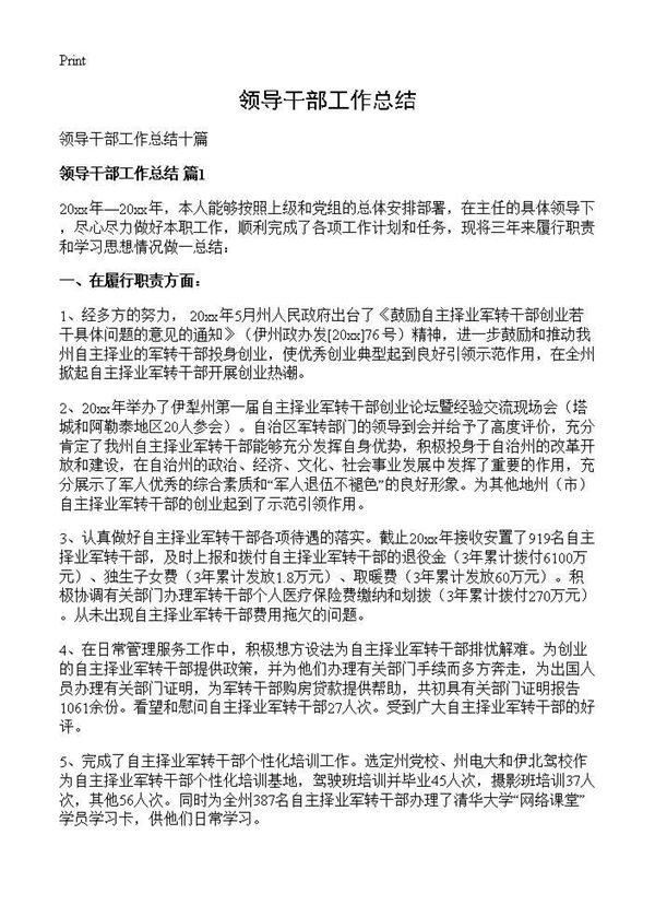 领导干部工作总结是对一定时期内领导工作的全面回顾与系统梳理,旨在客观反映工作成效、分析存在问题、提炼经验教训、明确改进方向。总结内容通常涵盖思想政治建设、履职尽责情况、党风廉政建设、团队管理成效以及服务群众成果等方面,既要突出亮点成绩,也要直面短板不足,体现实事求是、求真务实的工作作风。高质量的总结应做到数据详实、案例具体、分析透彻,既是对过去工作的理性审视,也为下一步科学决策提供重要依据,是领导干部提升执政能力、推动事业发展的有效工具。