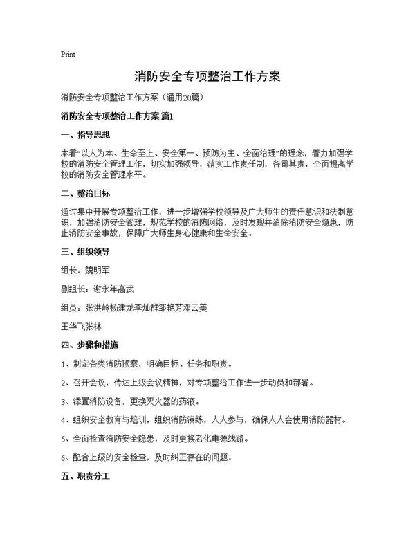 消防安全专项整治工作方案是针对当前消防安全领域存在的突出问题和隐患,制定的一系列系统性、针对性的整治措施。该方案旨在通过全面排查、重点整治、长效监管等手段,有效预防和减少火灾事故的发生,保障人民群众生命财产安全和社会稳定。方案通常包括整治目标、重点任务、责任分工、时间安排和保障措施等内容,强调部门联动、社会参与,确保整治工作落到实处,提升整体消防安全水平。