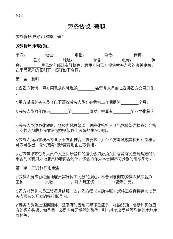劳务协议(兼职)是雇主与兼职劳动者之间签订的一种法律文件,用于明确双方在兼职工作期间的权利和义务。该协议通常包括工作内容、工作时间、薪酬标准、保密条款、违约责任等内容,确保兼职工作的合法性和规范性。通过签订劳务协议,雇主可以规范用工行为,兼职劳动者也能获得相应的权益保障,避免劳动纠纷的发生。劳务协议(兼职)适用于各类短期、灵活或非全日制的工作形式,是维护双方合法权益的重要依据。