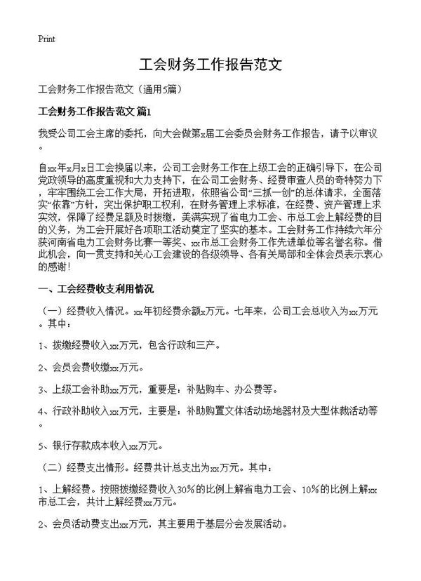 工会财务工作报告是工会组织向会员代表大会或全体会员汇报一定时期内工会经费收支、使用和管理情况的重要文件。该报告旨在增强工会财务工作的透明度,接受会员监督,确保工会经费合理合规使用。范文通常包括经费收入来源(如会费收缴、行政拨缴、上级补助等)、支出明细(如职工活动、维权支出、帮扶救助等)、经费结余情况以及财务管理措施等内容,要求数据真实、表述清晰、格式规范,体现工会经费"取之于职工,用之于职工"的原则。